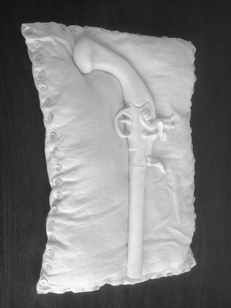 Previous Image Next Image Eva Melas_Gun on Pillow (b&w image)_Porcelain, Linen, Abalone Buttons, Thread, Pillow Stuffing_2016 Eva Melas_ Gun on Pillow (b&w image of sculpture)_ Porcelain, Linen, Abalone Buttons, Thread, Pillow Stuffing_ 2016