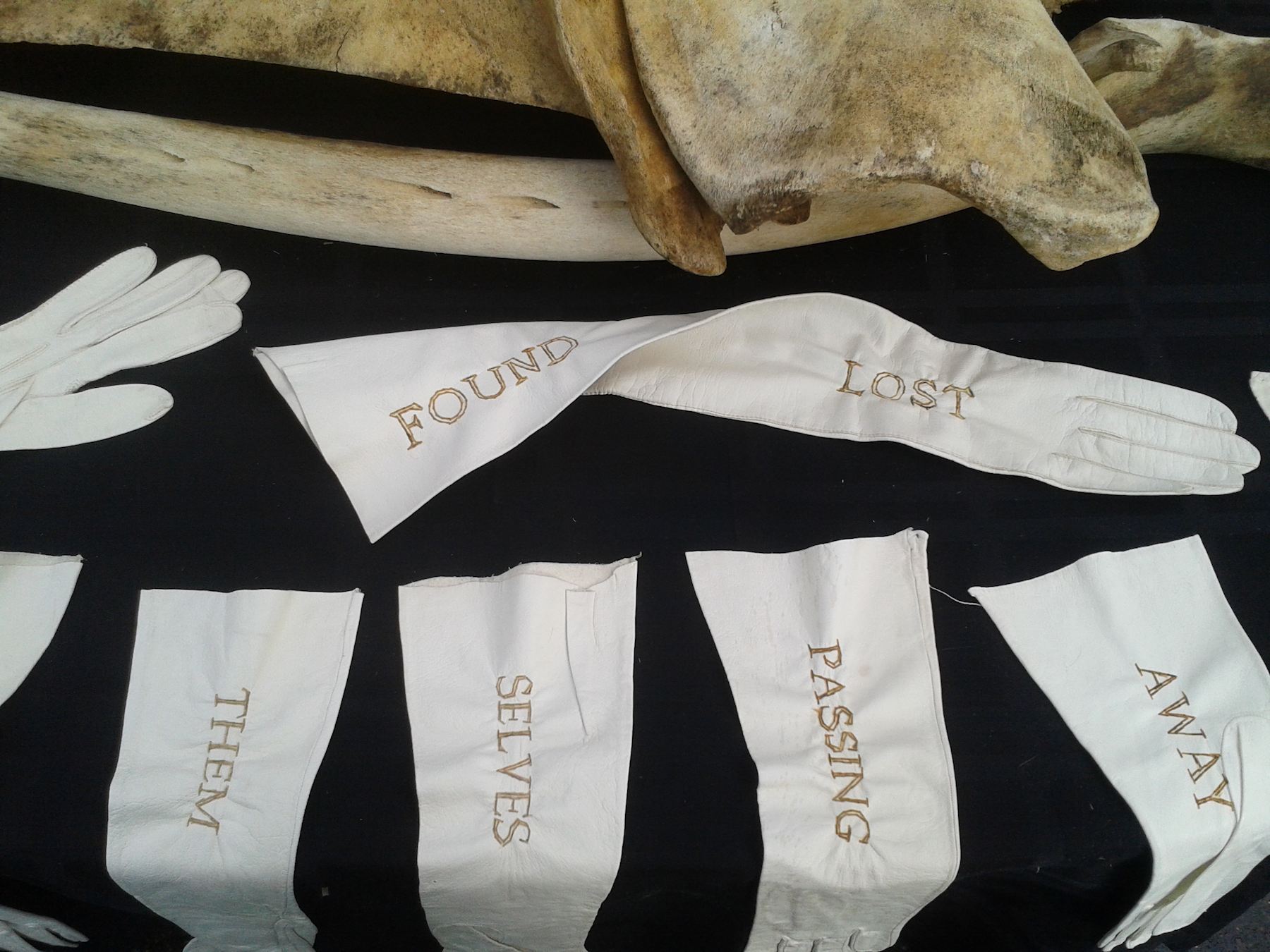 Previous Image Next Image Sasha Chavchavadze_The Gowanus Lost and Found Vintage Kid Glove Series_Minke Whale Skull, Kid Gloves Burned With Text_2014 Sasha Chavchavadze_ The Gowanus Lost and Found Vintage Kid Glove Series_ Minke Whale Skull, Kid Gloves Burned With Text_ 2014